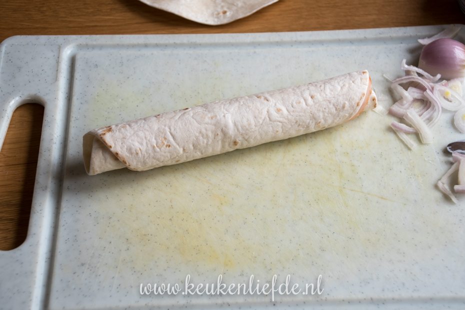 Haal de wraps uit het vershoudfolie en snijd ze met een broodmes in plakjes.