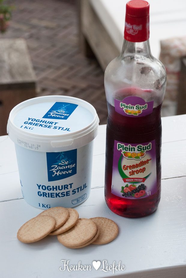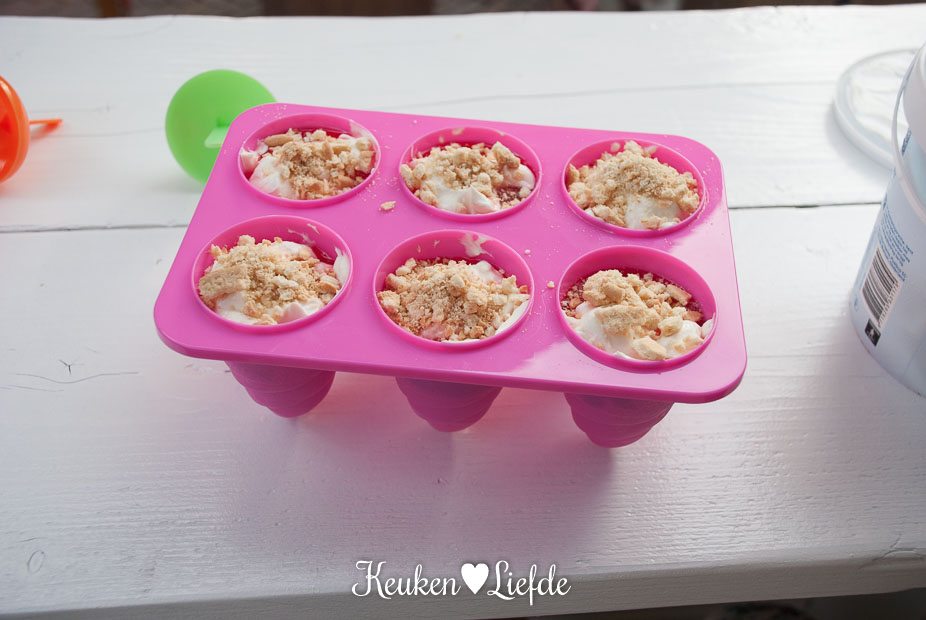Verkruimel de koekkruimels. Roer de uitgelekte yoghurt los met de suiker en vul de ijslollyvormpjes ermee, niet helemaal vol. Schenk er een scheut grenadinesiroop bij en voeg wat koekkruimels toe en roer dit met een roerstaafje door de yoghurt. Roer niet te lang, zodat je een mooie swirl door de yoghurt krijgt. Eindig met een laagje yoghurt, zodat de vormpjes helemaal gevuld zijn.