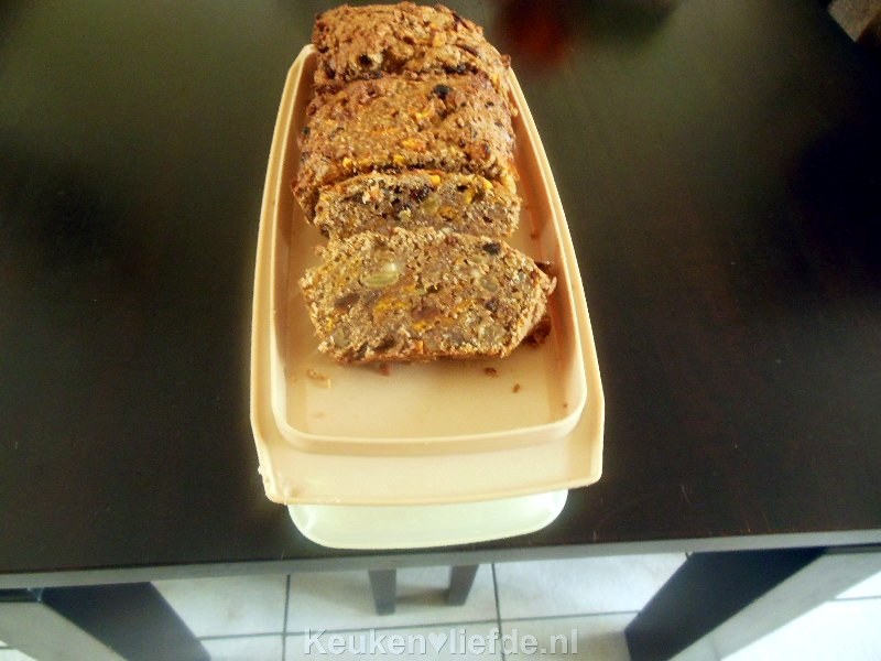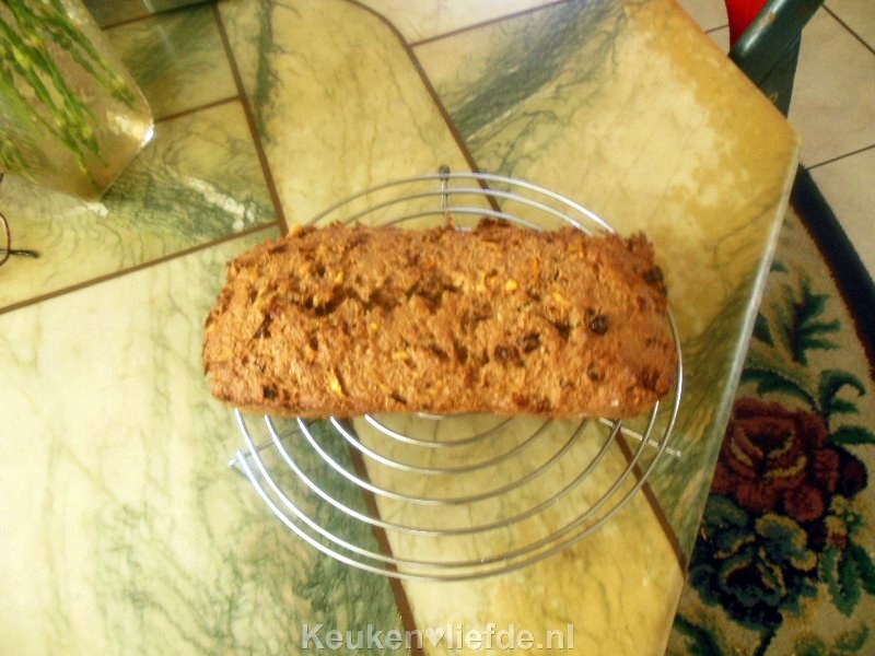 Iets onder het midden in een voorverwarmde oven van 175 graden ca. 1 uur bakken. ik heb ze iets langer gebakken. Dit is geen cake zoals je zou verwachten, voor mij hield hij het midden tussen een kruidkoek en mueslibrood.