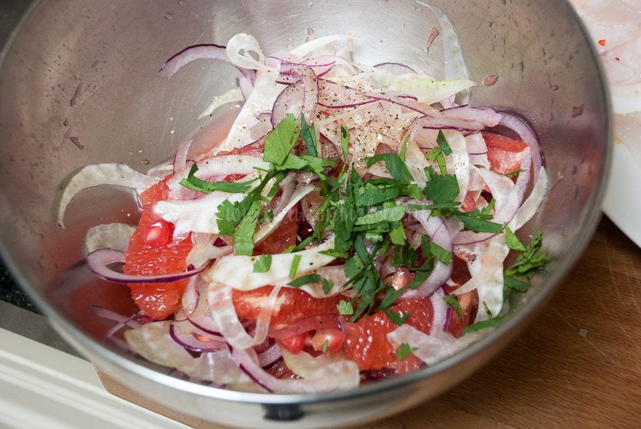 Snijd de schil van de grapefruit en snijd de partjes grapefruit, boven een kom, uit hun vliesje. Doe de grapefruitpartjes in de kom en voeg het sap uit de overgebleven grapefruit toe. Voeg de granaatappelpitjes, rode ui, venkel en koriander toe aan de grapefruit, samen met een scheut olijfolie, zout en peper. Hussel voorzichtig om.