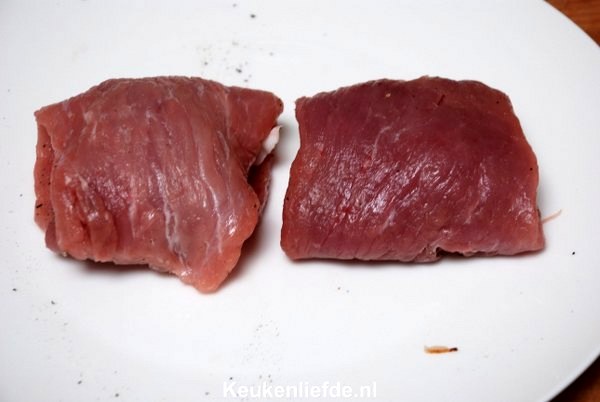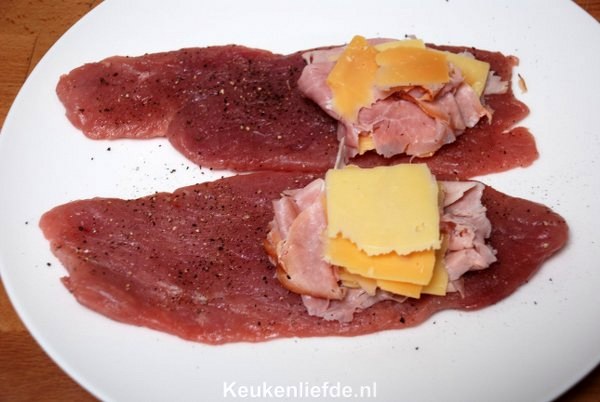 Dep de schnitzels droog met keukenpapier en bestrooi ze met zout en peper. Leg op iedere schnitzel een plak ham en kaas en vouw de schnitzels dicht.