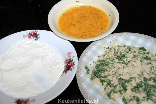 Zet drie borden klaar. Eén met bloem, één met losgeklopt ei en een bord met paneermeel vermengd met de peterselie.