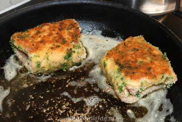 Probeer ze zo dicht te vouwen dat de kaas er tijdens het bakken niet uit kan lopen. Zoals je ziet op de foto gemaakt tijdens het bakken is dit mij helaas niet gelukt. Hoewel de druipende kaas er op de foto natuurlijk wel smakelijk uitziet is het lekkerder als de kaas tijdens het eten nog IN je cordon bleu zit.