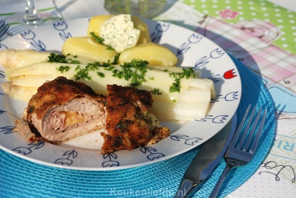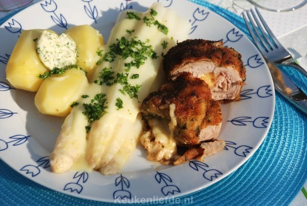 Ik serveerde de cordon bleu met wat gekookte asperges en aardappels overgoten met een lekkere Hollandaisesaus.