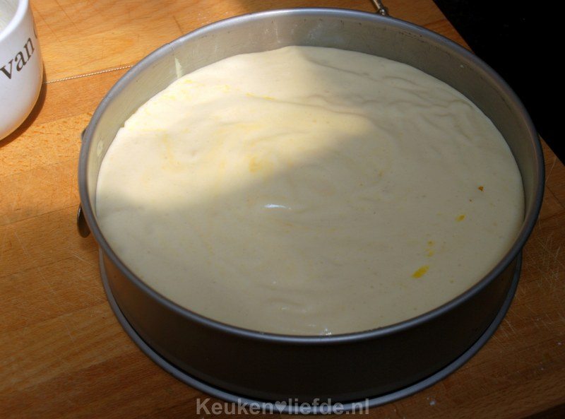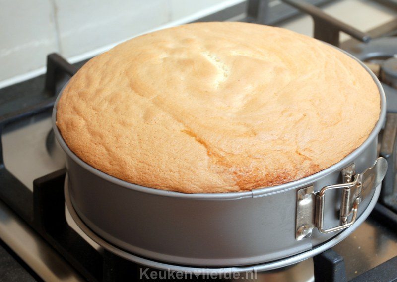 Haal de biscuit uit de oven en laat 15 minuten in de vorm afkoelen. De biscuitbodem rijst flink in de oven, maar zakt na het bakken weer gedeeltelijk in.