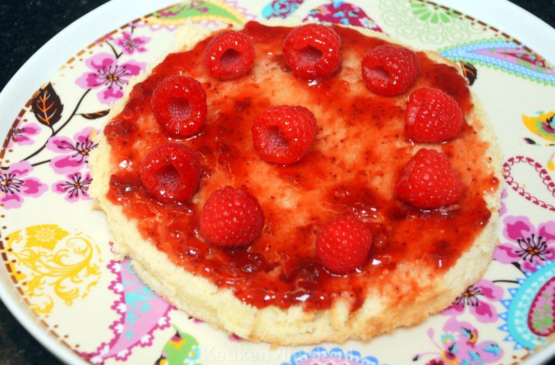 Leg de eerste taartbodem op een taartschaal. Bestrijk de bodem met de jam en verdeel er de helft van de frambozen over.