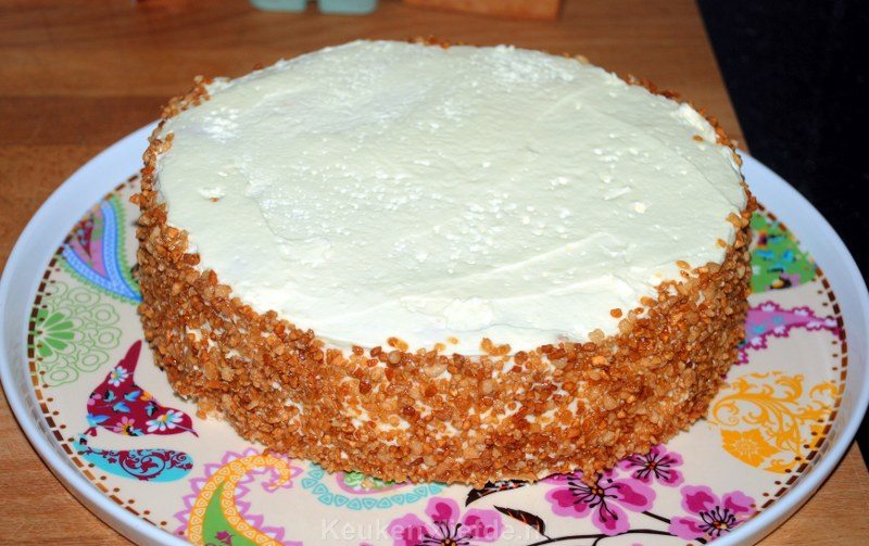 Druk met je handen de nogatine in de rand van de slagroomtaart (zie dit filmpje van Rudolph van Veen hoe je dit makkelijk doet).
