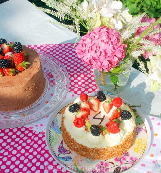 Ter ere van de alweer vierde verjaardag van ons kleine smulpaapje, besloot ik daarom deze feestelijke slagroomtaart geheel zelf te maken. Ook werd er natuurlijk weer een hemelse chocoladetaart gemaakt, want ja… die is nu eenmaal favoriet bij dochterlief.