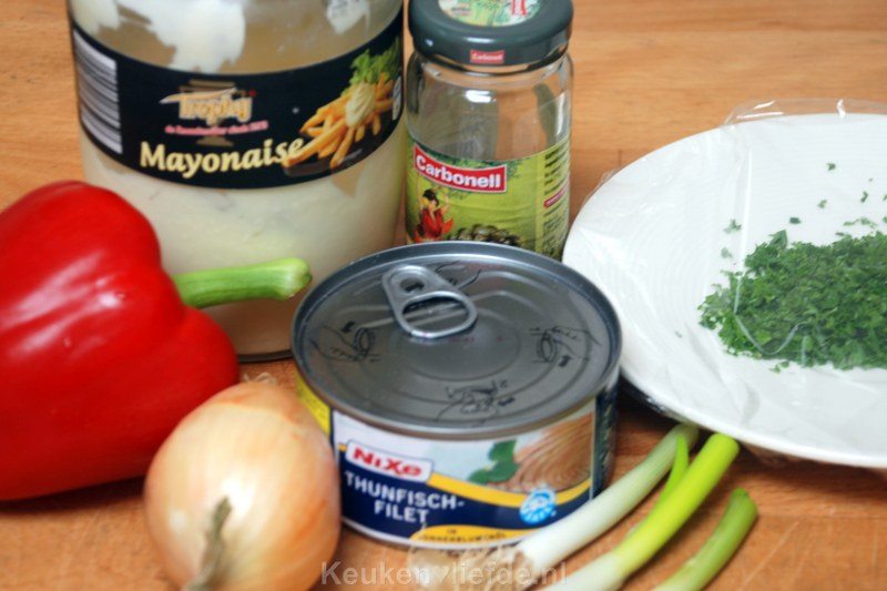 Laat de tonijn uitlekken en meng in een kom met alle overige ingrediënten.
