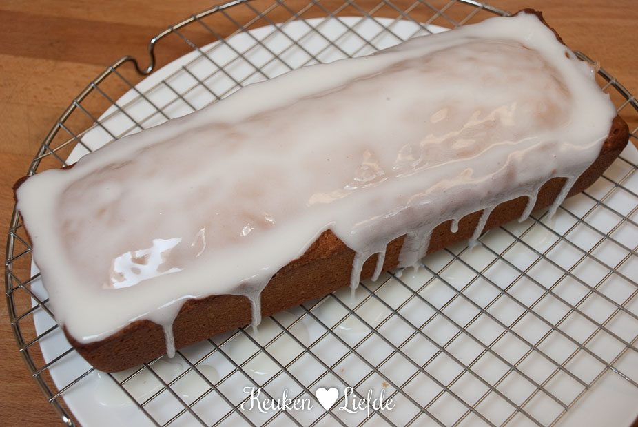 Bak circa 55 minuten in de oven. Laat 15 minuten in de vorm afkoelen en stort de cake op een rooster. Laat de cake op het rooster volledig afkoelen. Pers de andere helft van de citroen uit en roer door de poedersuiker, totdat de poedersuiker volledig is opgelost. Verdun het glazuur met een paar eetlepels melk, totdat je een dik, vloeibaar glazuur hebt. Giet dit over de cake en laat het glazuur hard worden.