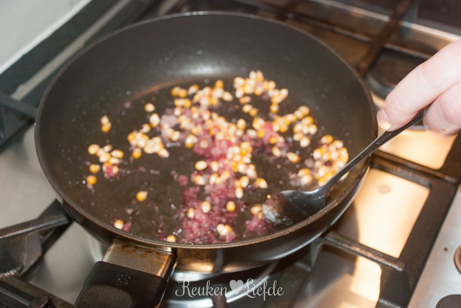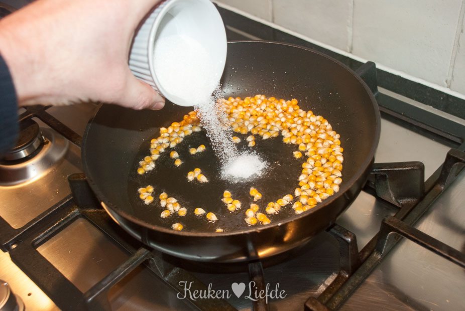 Verhit de pan met een beetje olie en laat goed warm worden. Voeg de maiskorrels toe met de suiker en een druppel kleurstof en doe de deksel op de pan. Schud de pan heen en weer om ervoor te zorgen dat alle maiskorrels zijn bedekt met suiker.
