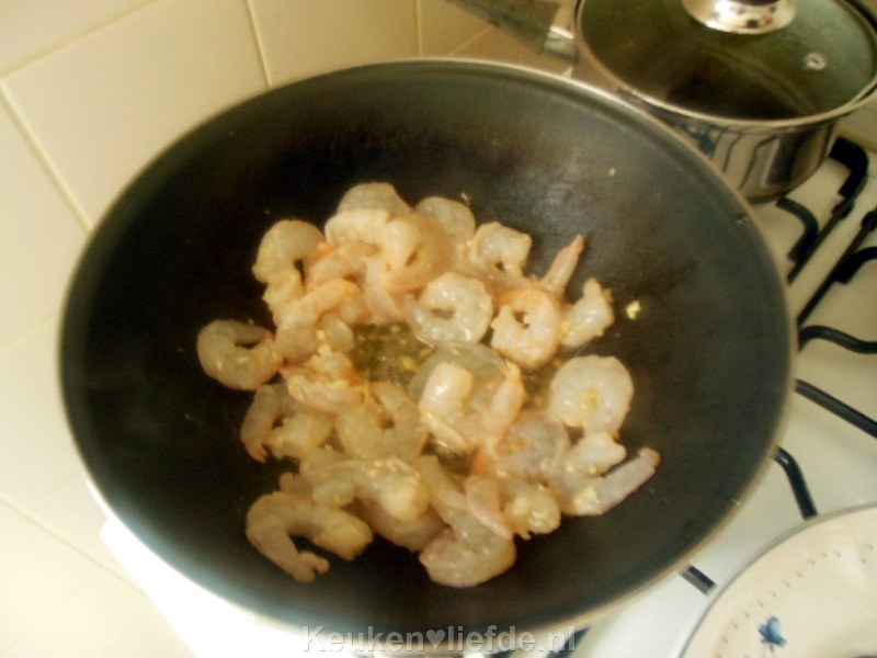 Verhit de wok met 2 el zonnenbloemolie en roerbak de garnalen met marinade.