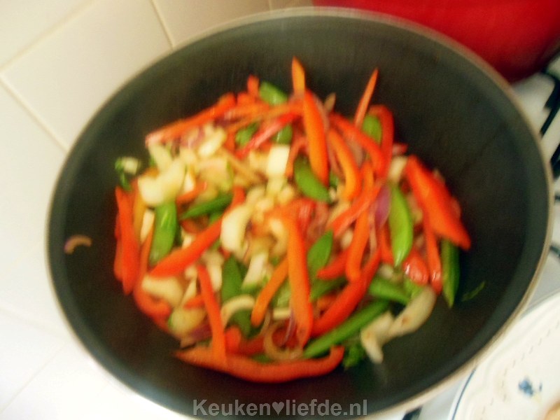 Ik had de lente-ui wel in huis maar ben het helaas vergeten. Heb dit recept nogmaals gemaakt maar dan met kipfilet. Ook lekker. Wij hebben dit met mihoen gegeten maar kan ook prima met rijst.