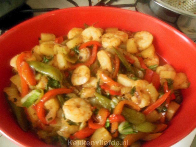 Zoetzure gamba’s met gemende groenten van Lya