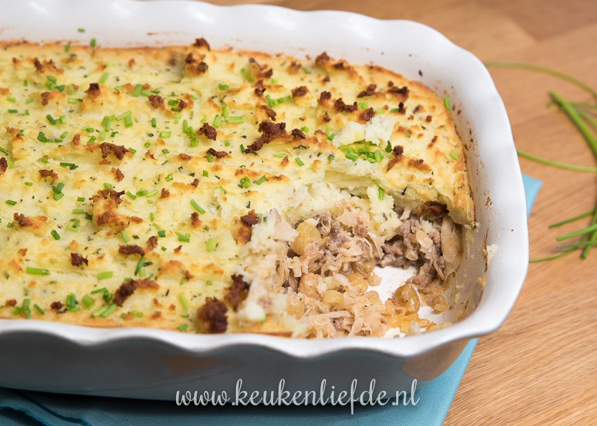 Zuurkool-ovenschotel met gehakt en crème fraîche